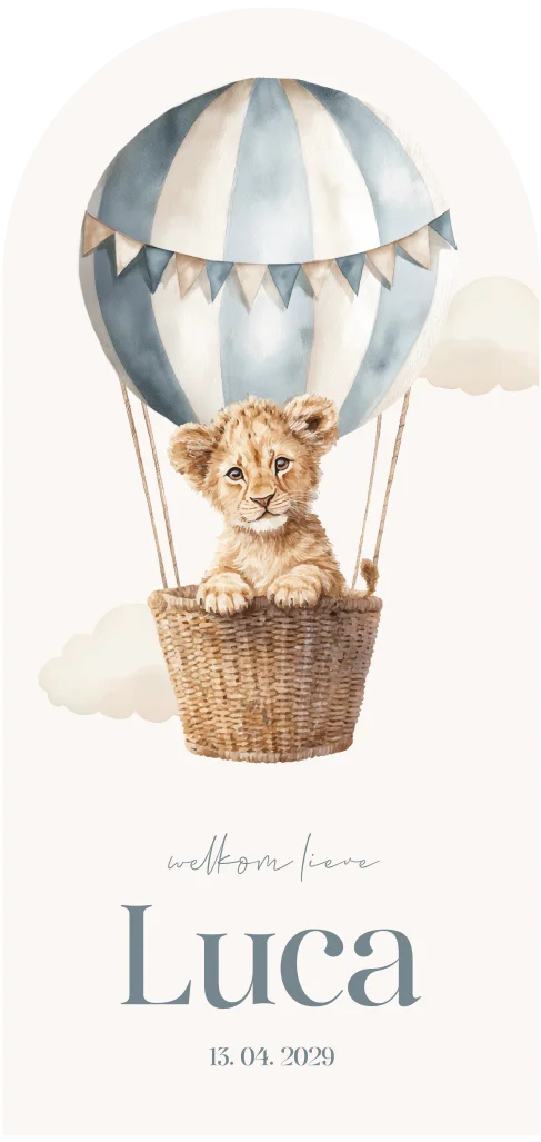 Krijgen jullie een jongetje? Hoe leuk is dan dit unieke geboortekaartje met leeuwtje in luchtballon. Het kaartje heeft een afgeronde bovenkant waardoor de luchtballon mooi uitkomt. De luchtballon met vlaggenlijn heeft aquarel blauwe kleuren wat zorgt voor een zachte uitstraling.