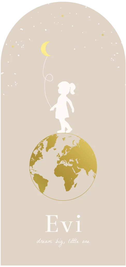 Op zoek naar een avontuurlijk geboortekaartje voor jullie dochtertje? Dit leuke geboortekaartje met een silhouet van een meisje op een wereldbol in goudfolie is een unieke en originele keuze.