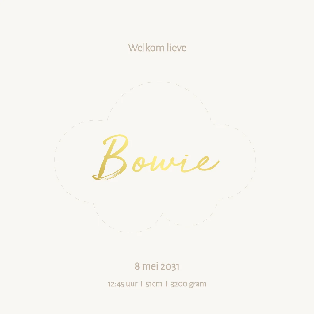 Vier de komst van jullie kleintje met dit prachtige beige geboortekaartje. Het subtiele doorkijkje onthult een speels wolkje en een elegant maantje, afgewerkt met luxe goudfolie voor een stralend effect. De neutrale tint maakt dit kaartje perfect voor zowel jongens als meisjes. Personaliseer de tekst en kies je favoriete lettertype om er een uniek aandenken van te maken.
