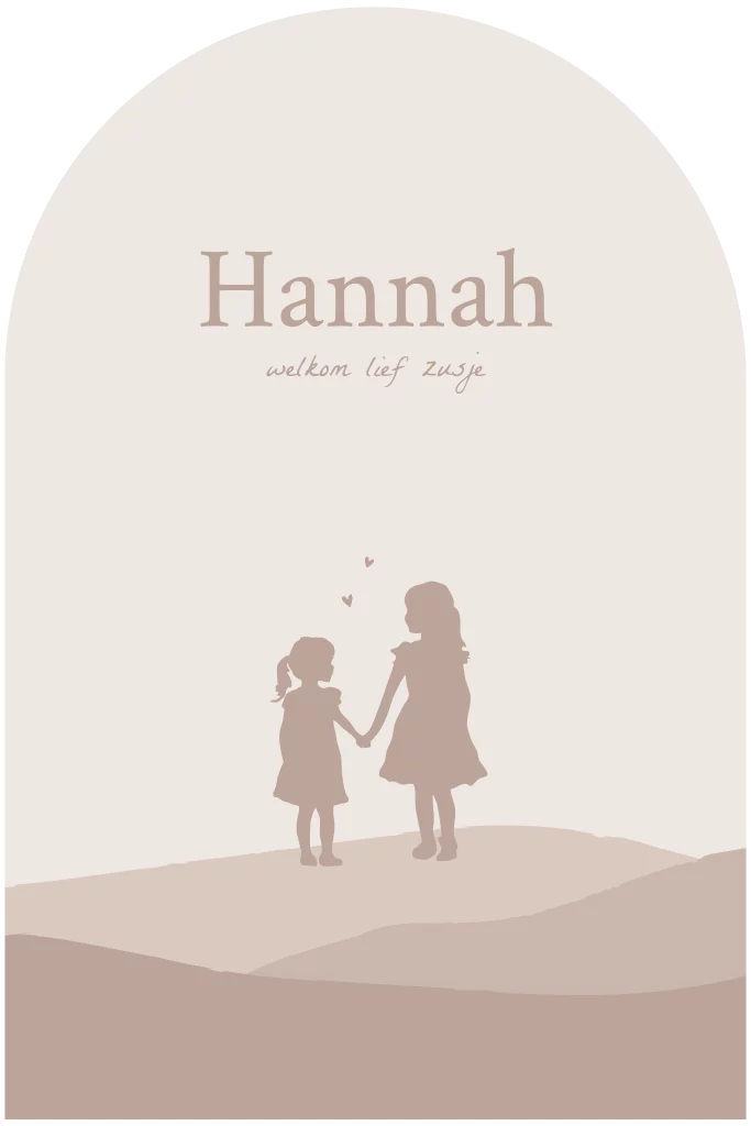 Dit boogvormige geboortekaartje heeft een mooie illustratie van een heuvellandschap met twee zusjes. De neutrale kleuren en silhouetten geven dit kaartje een rustige uitstraling. Ben je op zoek naar een andere gezinssamenstelling? Stuur ons een berichtje en wij helpen jou graag!