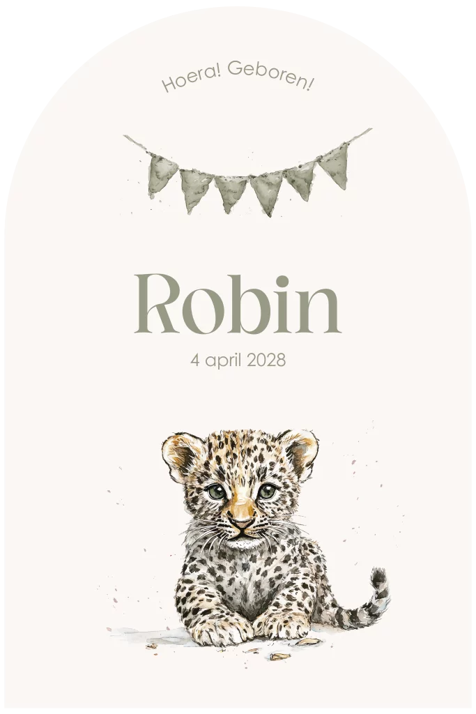 Boogvormig geboortekaartje met luipaard en vlaggenlijn groen