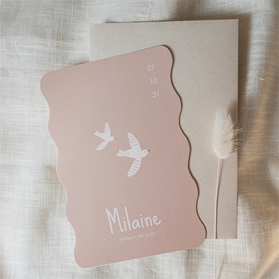Dit prachtige bruinroze geboortekaartje met schattige vogels en een speelse golfrand heeft een warme uitstraling. De zachte tinten en de vogeltjes maken het een bijzondere aankondiging voor de geboorte van jullie kindje. Het ontwerp is tijdloos en vol liefde.