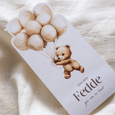 Vlieg mee met dit lieve beertje aan de beige ballonnen. Dit geboortekaartje is aan de bovenkant in de vorm van de ballonnen uitgesneden. Het ontwerp is geschikt voor zowel een jongen als meisje.
