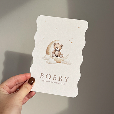 Dit dromerige geboortekaartje met een schattig beertje op de maan is perfect voor ouders die houden van een zachte en dromerige stijl. De golfrand geeft het ontwerp een unieke en speelse afwerking, waardoor het kaartje extra bijzonder oogt. Met de warme beige tinten straalt het rust, liefde en tederheid uit. Door de neutrale kleuren is dit kaartje geschikt voor zowel jongens als meisjes.