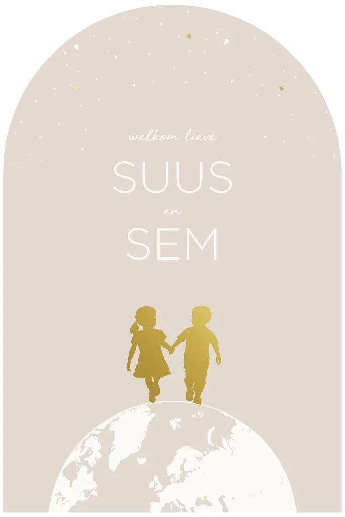Zijn jullie in verwachting van een tweeling? Maak het geboortekaartje extra persoonlijk met de silhouetten van jullie kindjes op de gouden aardbol. De samenstelling en kleuren zijn eenvoudig aan te passen in de handige editor.