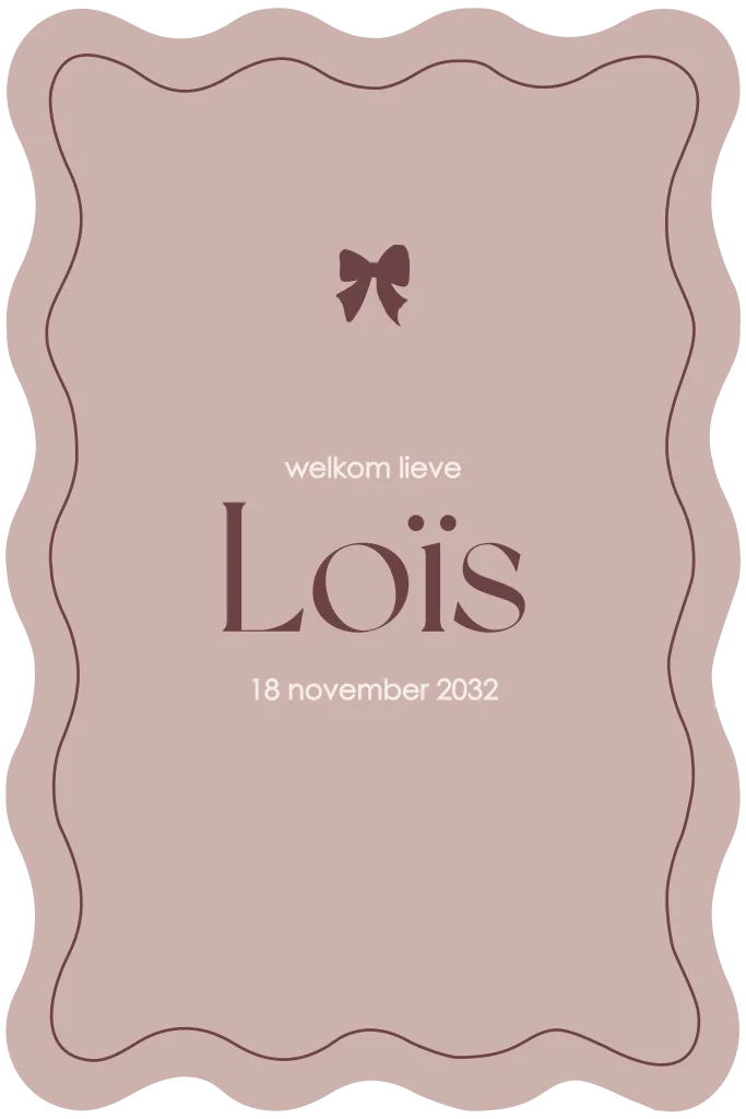Dit bruin-roze geboortekaartje met sierlijke golfrand is een zacht en romantisch ontwerp volgens de laatste trendkleuren. Het schattige strikje maakt het kaartje helemaal af en zorgt voor een lieve, klassieke look. Ideaal voor wie een subtiel maar toch uniek ontwerp zoekt. Voeg jullie eigen gegevens toe en maak het kaartje helemaal persoonlijk.