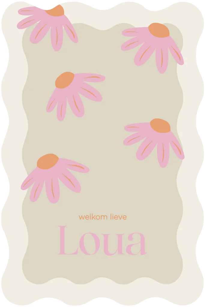 Geboortekaartje met golfrand en bloemen roze oranje