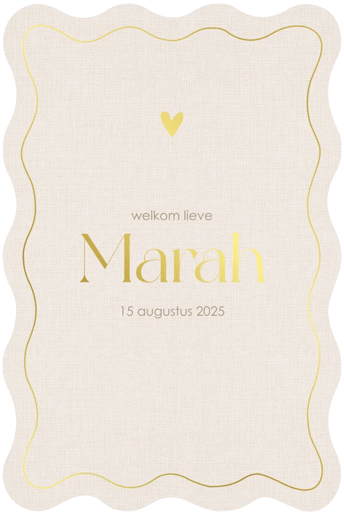 Dit geboortekaartje springt eruit door de speelse golfrand en rustige linnen achtergrond. De goudfolie geeft het ontwerp een warme, chique uitstraling. Ideaal voor een stijlvolle geboortekaart. Een prachtige mix van elegantie en zachtheid. Pas het ontwerp eenvoudig aan met jullie eigen gegevens en maak het helemaal persoonlijk.