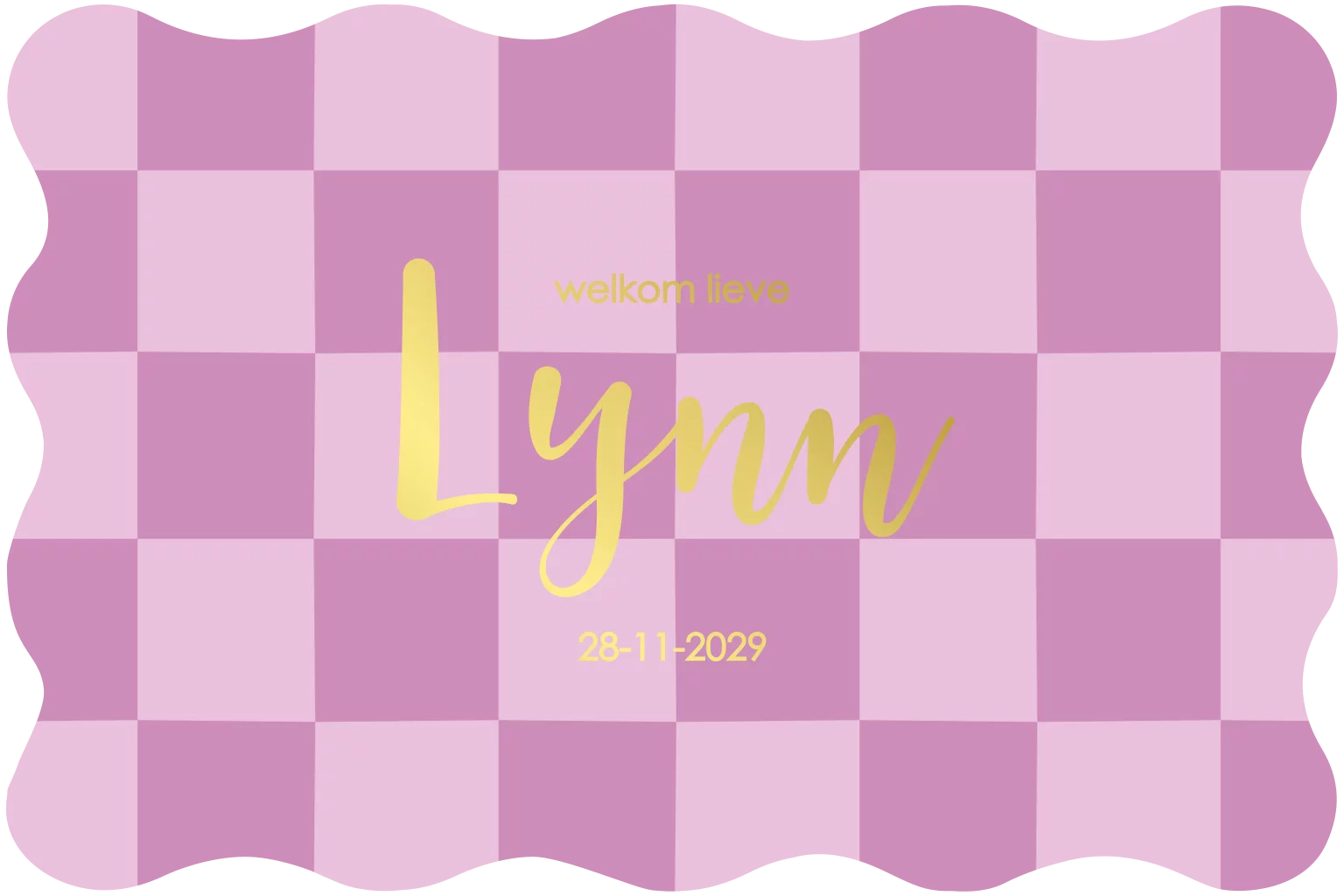 Geboortekaartje lila blokjesprint met goudfolie en golfjesrand
