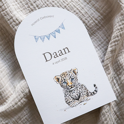 Ben je op zoek naar een origineel en opvallend kaartje met een lieve twist? Dan past dit kaartje perfect bij jou. De boogvorm met illustratie van een baby luipaard maakt dit kaartje uniek.