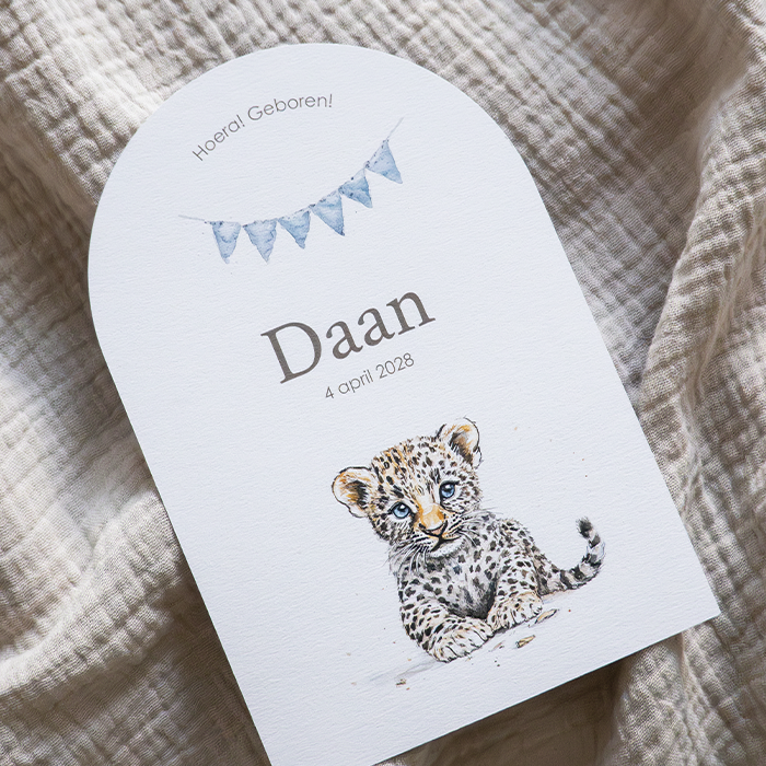 Geboortekaartje met luipaard en vlaggenlijn blauw boogvorm