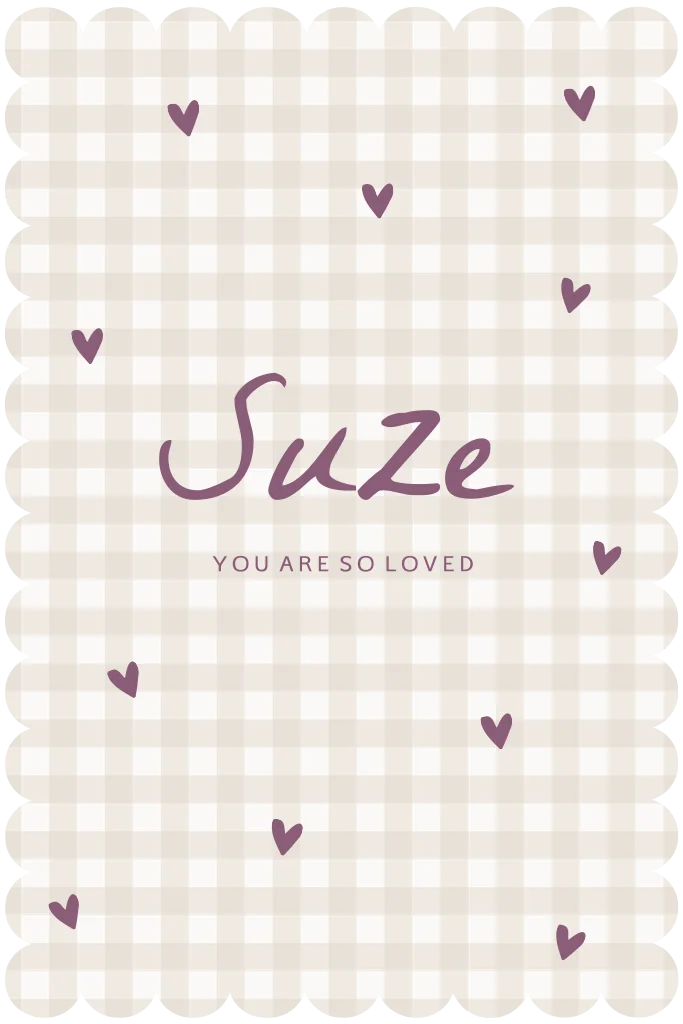 Op zoek naar een zacht en romantisch geboortekaartje? Dit geboortekaartje heeft een beige ruitprint, lieve hartjes en een unieke schulprand. Het klassieke ruitpatroon krijgt door de neutrale kleur een moderne en rustige uitstraling. De hartjesprint in plum kleur maakt het kaartje helemaal van nu.