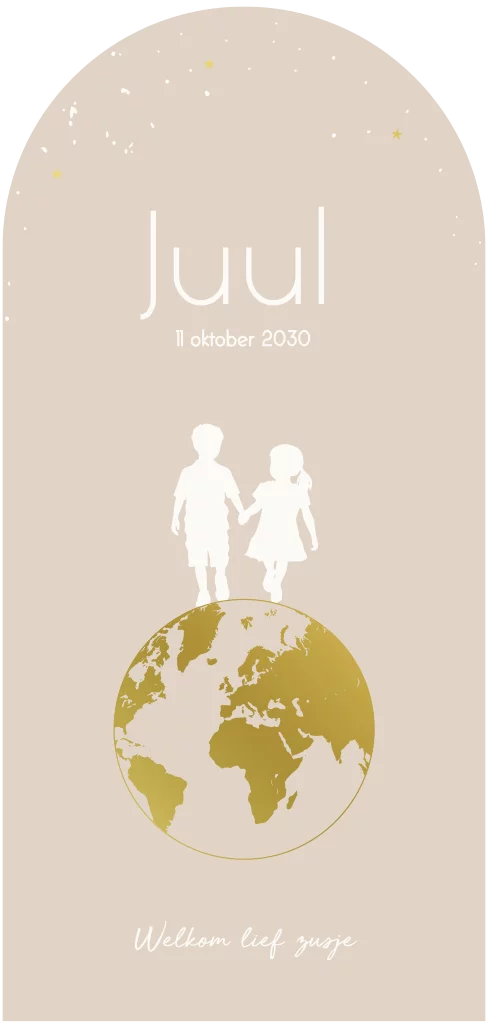 Hoera! Jullie zoontje krijgt een zusje. Dit prachtige geboortekaartje heeft een illustratie van een broertje en een zusje op een gouden wereldbol. Samen gaan zij op avontuur.