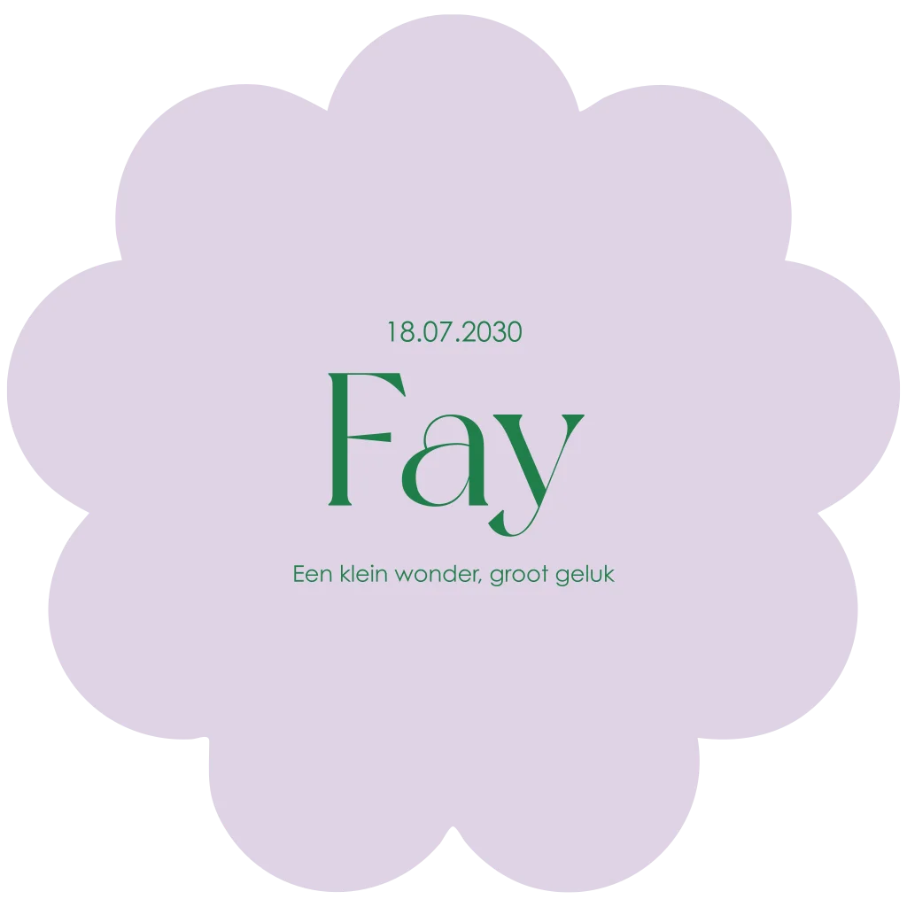 Lila is niet meer weg te denken uit het kleurenpalet! Laat deze vrolijke kleur terugkomen in jullie unieke geboortekaartje in de vorm van een bloem. De groene typografie geeft een eigentijds color blocking effect.