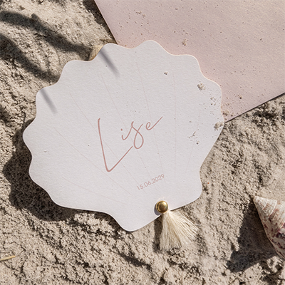 Wil je een origineel kaartje? Kies dan voor een geboortekaartje in de vorm van een schelp. De combinatie van off-white en roze zorgt voor een zachte en lieflijke uitstraling. Maak het geboortekaartje helemaal af en knoop een fluwelen koord of een kwastje met splitpen door het gaatje.