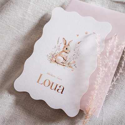 Een lief geboortekaartje met een konijntje tussen bloemetjes en een hartje. Het kaartje heeft een speelse golfrand. De zachte illustratie geeft dit kaartje een warme en dromerige uitstraling. Ideaal voor ouders die op zoek zijn naar een schattig geboortekaartje voor een meisje.