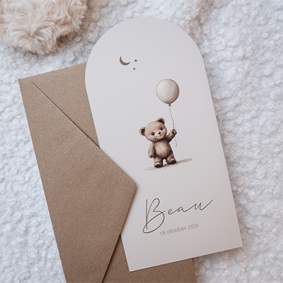 Een zacht en neutraal geboortekaartje met een lief beertje dat een ballon vasthoudt. Het kaartje is perfect voor zowel jongens als meisjes. De bijzondere boogvorm geeft het kaartje een unieke en speelse uitstraling. Dankzij de zachte kleuren en schattige illustratie past dit kaartje prachtig bij een warme, rustige geboorteaankondiging. Maak het persoonlijk met je eigen tekst en kies een bijpassende envelop voor de finishing touch.