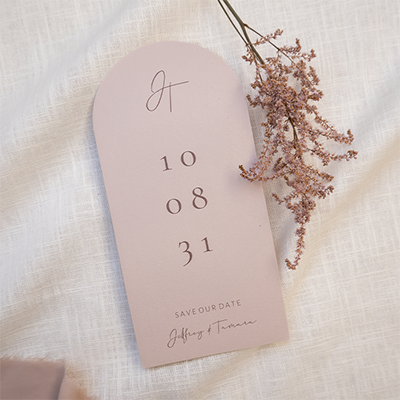 Deze save the date kaart heeft een langwerpige boogvorm in oudroze met jullie initialen als eyecatcher. De combinatie van vorm, kleur en typografie maakt hem uniek en modern. Perfect voor een persoonlijke aankondiging van jullie bruiloft. Aanpasbaar naar jullie stijl.