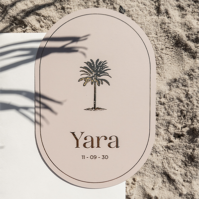 Dit prachtige geboortekaartje heeft een bijzondere vorm en een illustratie van een palmboom. De goudfolie geeft dit kaartje een luxe uitstraling.