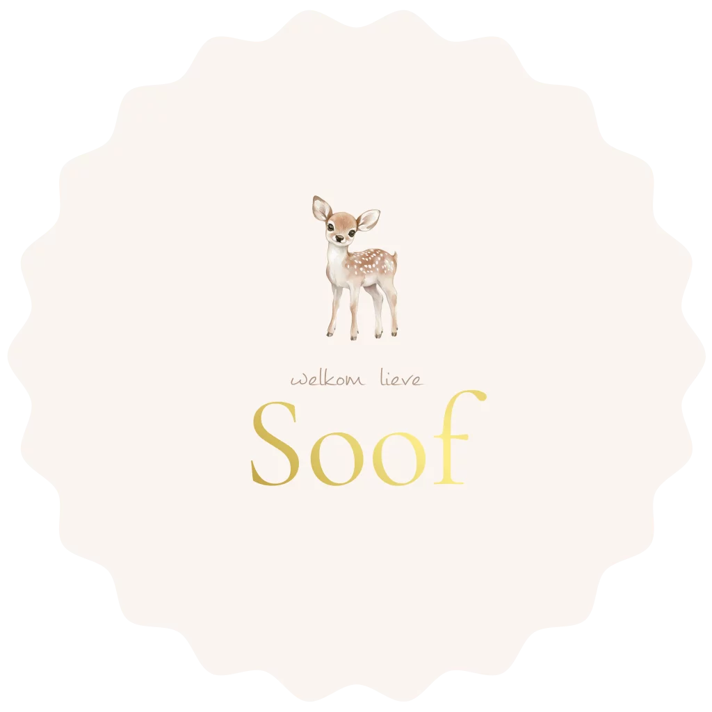 Hoe lief is dit ronde geboortekaartje met een watercolor illustratie van een hertje. Het geboortekaartje is afgewerkt met een schulprand en goudfolie.