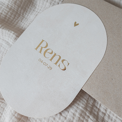 Dit ovalen geboortekaartje heeft een stoere uitstraling door een betonlook achtergrond. De goudfolie geeft het kaartje een sjiek effect. Het minimalistische ontwerp straalt luxe en originaliteit uit.