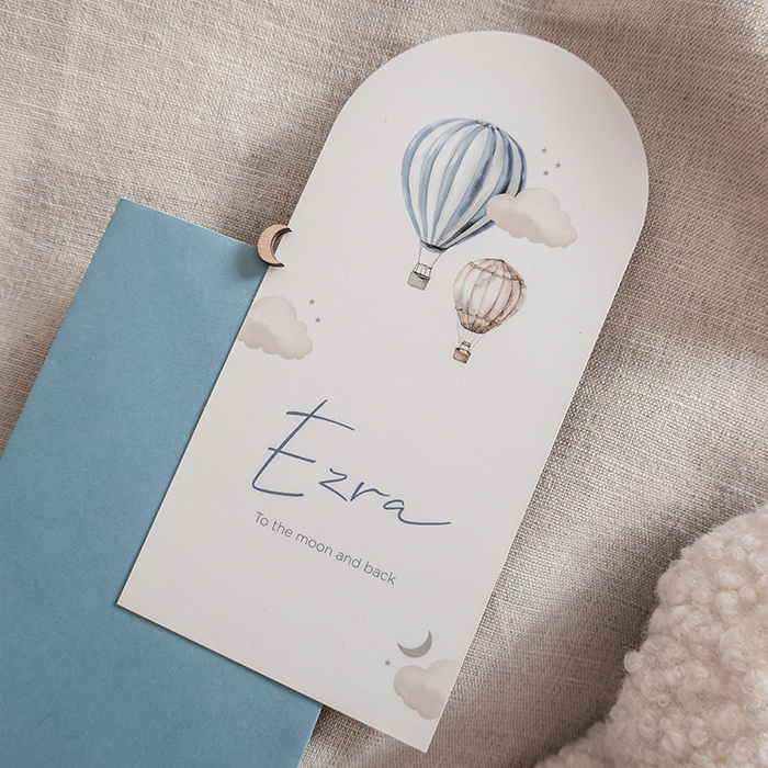 Uniek geboortekaartje met afgeronde bovenkant en zachte blauwe tinten, versierd met lieve luchtballonnen. Het speelse ontwerp straalt rust en avontuur uit — perfect voor een dromerig geboortekaartje. Dankzij de afgeronde vorm krijgt het kaartje een stijlvolle en moderne twist. Personaliseer eenvoudig en bestel een proefdruk van jullie droomkaartje.