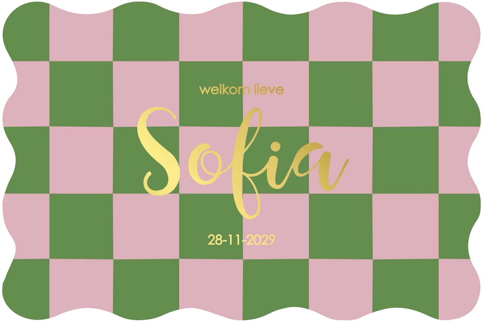 Uniek geboortekaartje golfrand met groene en roze blokjesprint en goudfolie