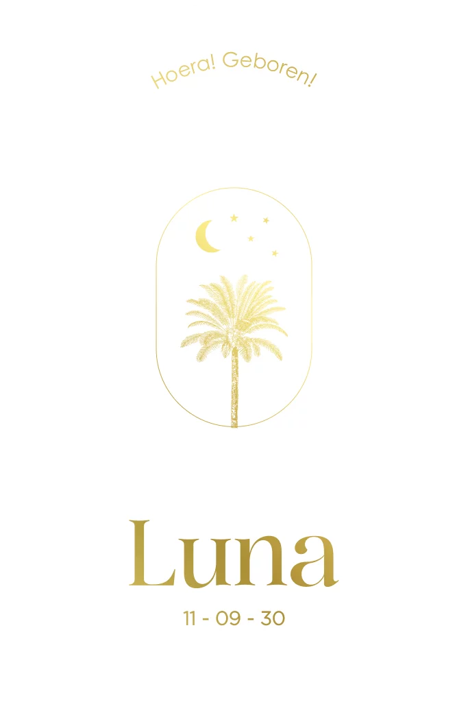 Wit geboortekaartje in boogvorm met palmboom goudfolie