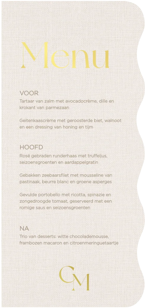 Presenteer jullie diner in stijl met deze golvende menukaart in linnenlook met luxe goudfolie. De golfrand geeft het ontwerp een speelse touch, terwijl de folie zorgt voor een chique uitstraling. Een perfecte aanvulling op jullie dinertafel. Combineer met de andere Pure Linen items voor een elegante en samenhangende uitstraling.