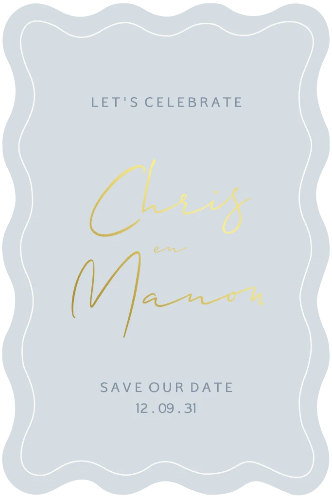 Geef jullie trouwdatum op een chique manier door met deze save the date kaart in lichtblauw met goudfolie. De golfrand en glanzende accenten zorgen voor een luxe uitstraling, terwijl de kleur zorgt voor rust en elegantie. Perfect voor een stijlvolle en verfijnde bruiloft. Combineert prachtig met andere kaarten uit de Botanical Blue serie.