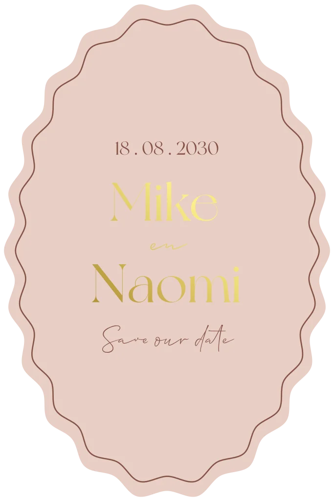 Deze ovale save the date kaart met golfrand combineert speelsheid met romantiek. De zachte oudroze kleur en vloeiende lijnen maken hem perfect voor een stijlvolle, persoonlijke aankondiging. Laat gasten alvast in de sfeer komen van jullie bruiloft. Voeg eenvoudig jullie namen en datum toe.