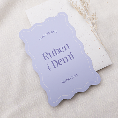 Met deze hippe Save the date kaart zijn jullie helemaal on trend. De lila kleur is in een mooie pasteltint en de golfrand is erg uniek. Het leuke is dat je jullie wedding stationary hier helemaal op kunt laten aansluiten met de trouwhuisstijl Pastel Allure.