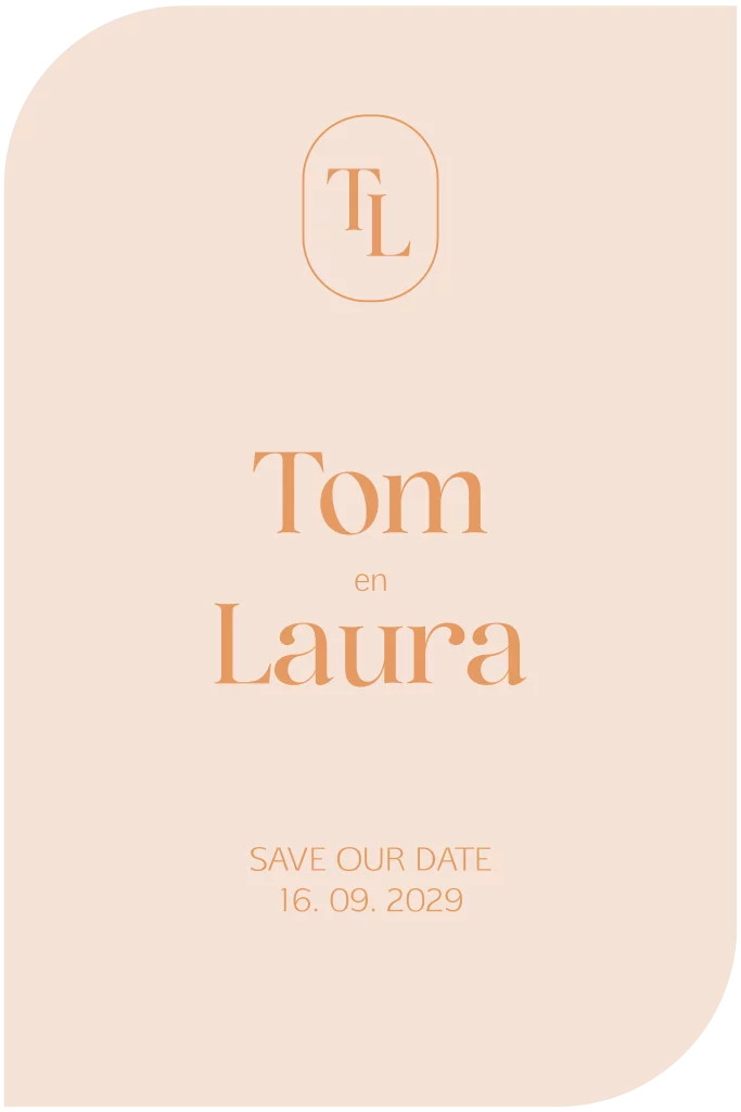 Als jullie gasten deze vrolijke save the date kaart door de brievenbus krijgen, hebben ze gelijk nog meer zin in jullie bruiloft! De peach oranje kleur en de bijzondere vorm geeft de kaart een vrolijke uitstraling. Het logo met jullie initialen kun je doortrekken in de gehele Trouwhuisstijl Pastel & Peach.