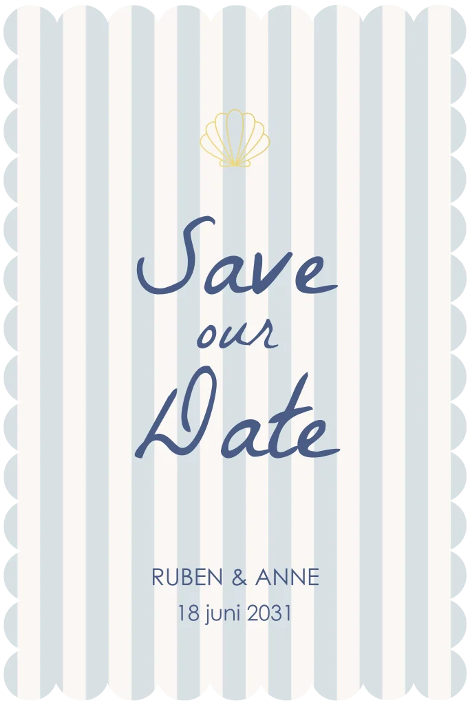 Deze save the date kaart springt eruit door de golvende schulprand en de zachte strandkleuren in streepprint. Ideaal voor een ontspannen, zomerse bruiloft met een natuurlijke look. De organische vormen geven de kaart een speelse en romantische uitstraling. Maak de kaart persoonlijk en bestel een proefdruk.