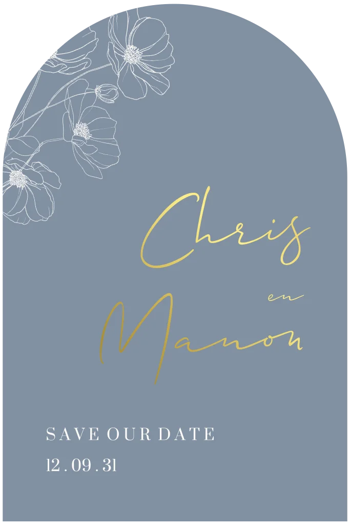 Deze stijlvolle save the date kaart in blauw is versierd met een fijne lijntekening van bloemen. Het ontwerp voelt luxe en tijdloos aan. Geschikt voor koppels die houden van eenvoud met een creatief randje.