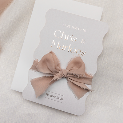 Laat jullie gasten in stijl weten dat ze de datum alvast mogen noteren met deze sjieke save the date kaart. De combinatie van een subtiele linnen achtergrond, elegante golfrand en luxe goudfolie maakt dit ontwerp een echte eyecatcher. Perfect voor stellen die op zoek zijn naar een chique en tijdloze uitstraling. Maak de kaart helemaal af met een zijde lint eromheen. Zo geef je jullie save the date een extra persoonlijke en feestelijke touch.