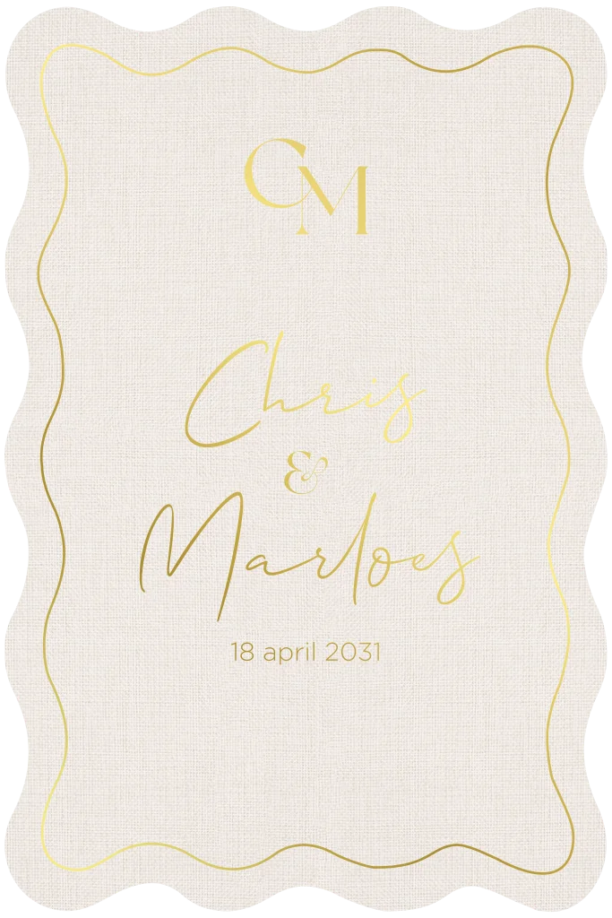 Deze trouwkaart met golfrand, linnenlook en goudfolie is een echte eyectcher. Perfect te combineren met de andere items uit de Pure Linen trouwhuisstijl. De golvende rand geeft een speels detail, terwijl de luxe afwerking zorgt voor een chique uitstraling.