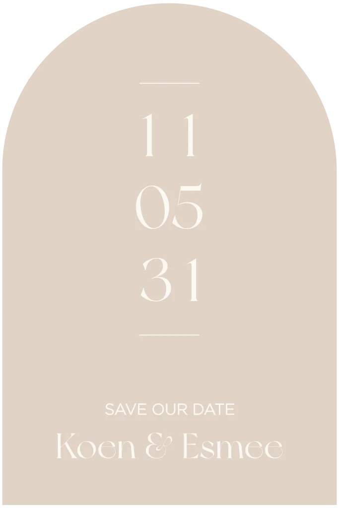 Laat jullie trouwdatum alvast stralen met deze stijlvolle save the date kaart in boogvorm met warme zandtint. De natuurlijke kleur en minimalistische vormgeving geven de kaart een moderne en elegante uitstraling. Dankzij de bijzondere vorm is het een echte eyecatcher. Personaliseer de kaart eenvoudig met jullie namen en datum voor een unieke eerste indruk van jullie bruiloft.