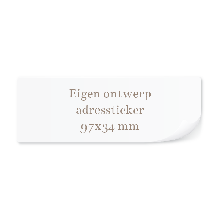 Ontwerp je eigen adressticker 97x34 mm met ronde hoeken voor een strakke afwerking van je kaartverzending. De zachte hoeken geven een luxe uitstraling. Ideaal om vooraf te bestellen, zodat je je enveloppen compleet kunt maken met bijpassende sluitstickers en postzegels. Bij ‘Opties selecteren’ kies je uit 1 tot en met 6 vellen, waarbij elk vel 14 adresstickers bevat.