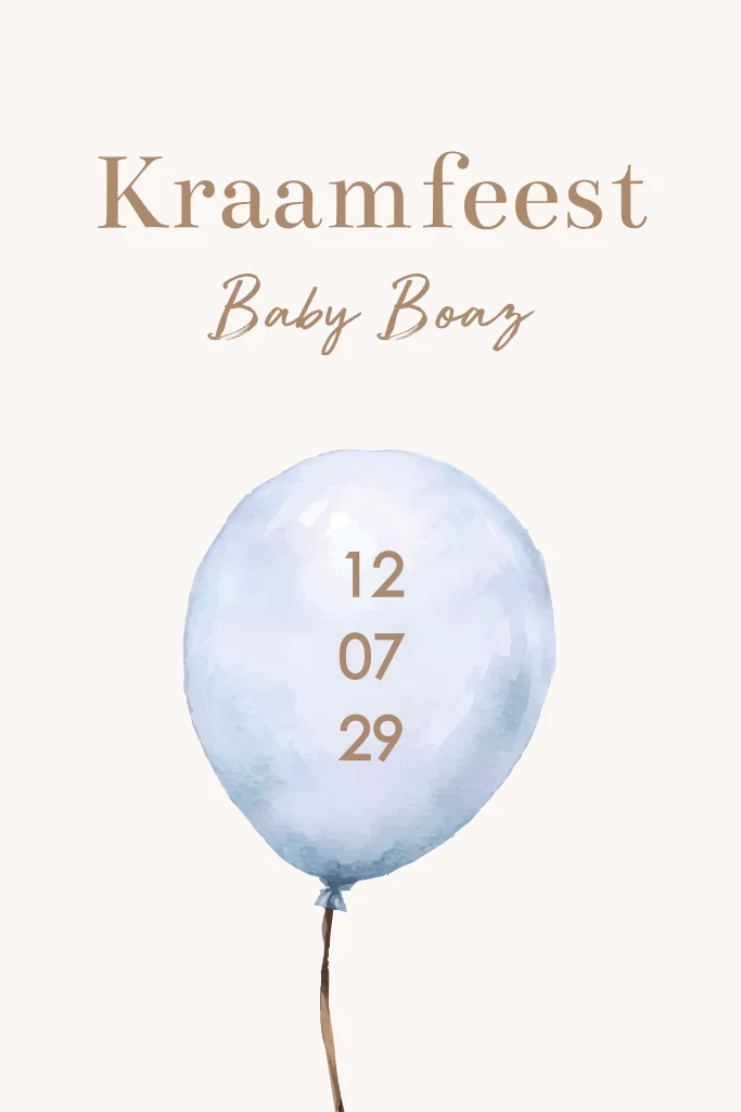 Vier de geboorte van jullie kindje met dit vrolijke kraamfeest kaartje met blauwe ballon. Het frisse ontwerp past perfect bij het bijpassende geboortekaartje. Personaliseer het eenvoudig en nodig vrienden en familie uit voor een gezellig samenzijn.