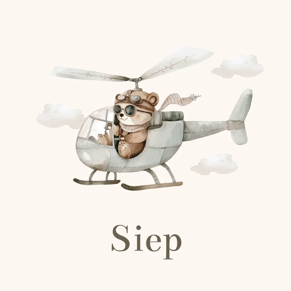 Style de babykamer af met deze stoere poster met een beertje in een helikopter. Leuk om als kraamcadeau te geven of voor je eigen jongetje te kopen. De poster is 40x40 cm. Op zoek naar een ander formaat? Stuur ons een berichtje en wij zetten dit voor jou in jouw account.