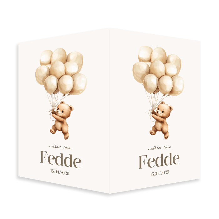 Zet jullie geboortekaartje om in een geboortebord zodat je dit bij de geboorte van jullie baby aan het raam kunt ophangen. Dit raambord heeft een illustratie van een beertje aan beige ballonnen. Zo lief!