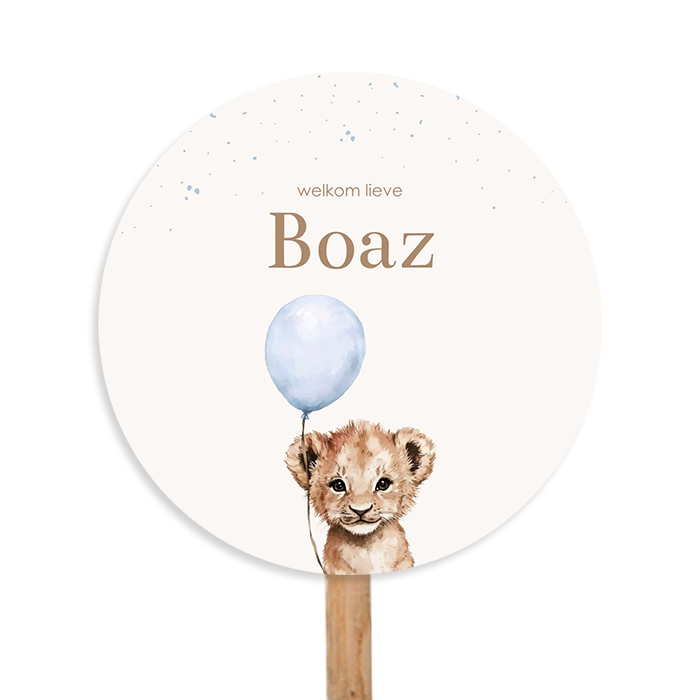Dit ronde tuinbord met een lief baby leeuwtje en blauwe ballon is dé blikvanger in de straat. De blauwe ballon geeft gelijk een feestelijk sfeertje in jullie voortuin.