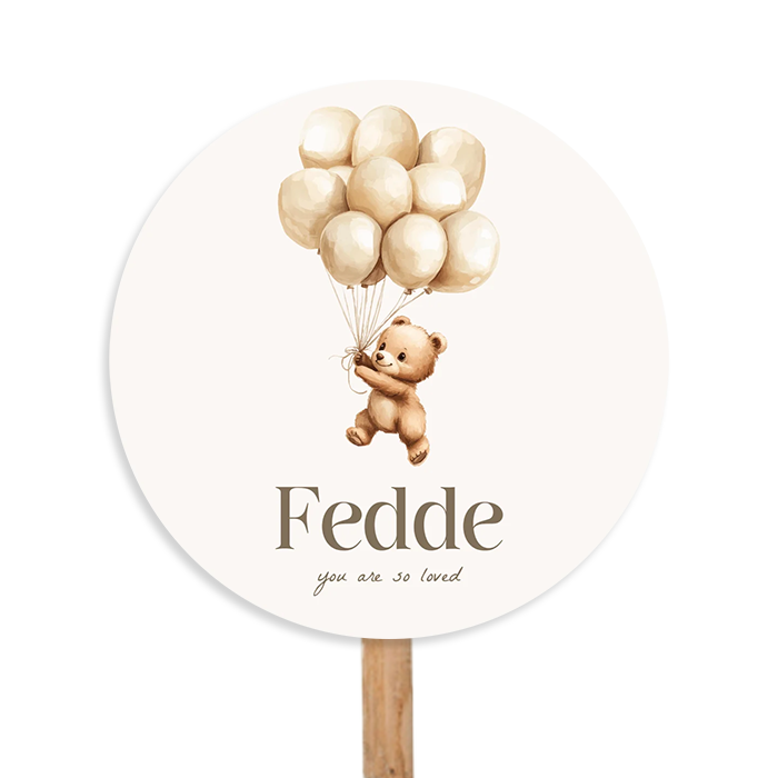 Rond tuinbord geboorte met beertje aan ballonnen beige