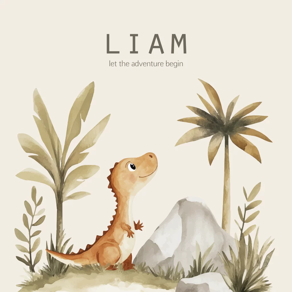 Hoe lief is deze baby dino tussen de rotsen en palmbomen. Dit beige geboortekaartje met een illustratie van een dino sluit helemaal aan op de dino trend. De baby dino is klaar voor het nieuwe avontuur!