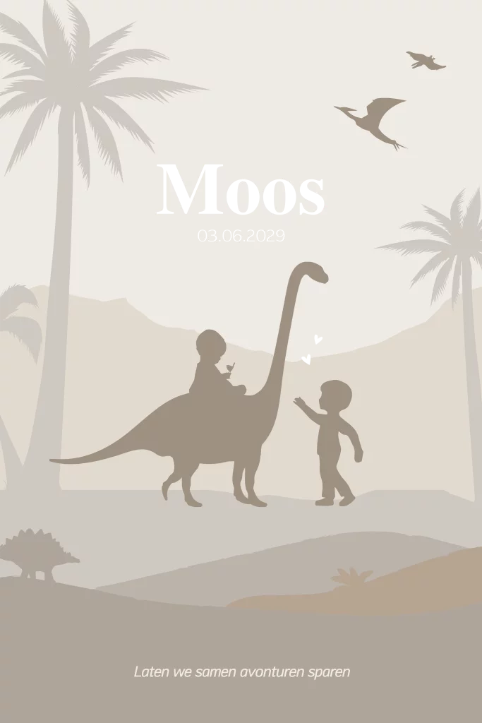Droom mee van dit avontuurlijke heuvellandschap met dino's en palmbomen. Dit geboortekaartje is geschikt voor 2 broertjes. Wil je liever een andere samenstelling, zoals bijvoorbeeld een broertje en een zusje? Neem dan contact met ons op. Wij helpen je graag!