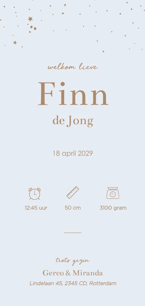 Dit geboortekaartje voor een jongen straalt vrolijkheid uit met een lief konijntje en een blauwe ballon. De frisse en speelse illustratie maakt het een perfect kaartje om de komst van jullie zoon aan te kondigen. De print met sterretjes en het maantje maken dit kaartje helemaal af.