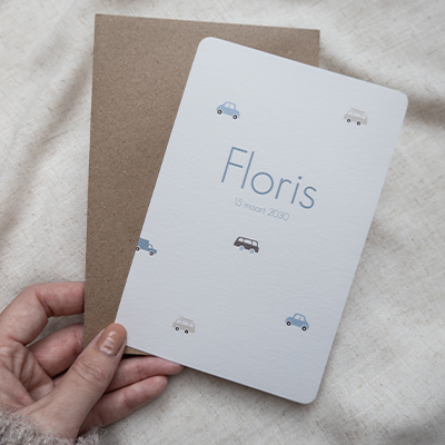 Zijn jullie in verwachting van een zoontje? Dit stoere en minimalistische ontwerp is perfect om de geboorte van jullie kleine man aan te kondigen. De autootjes geven het kaartje een speelse uitstraling.