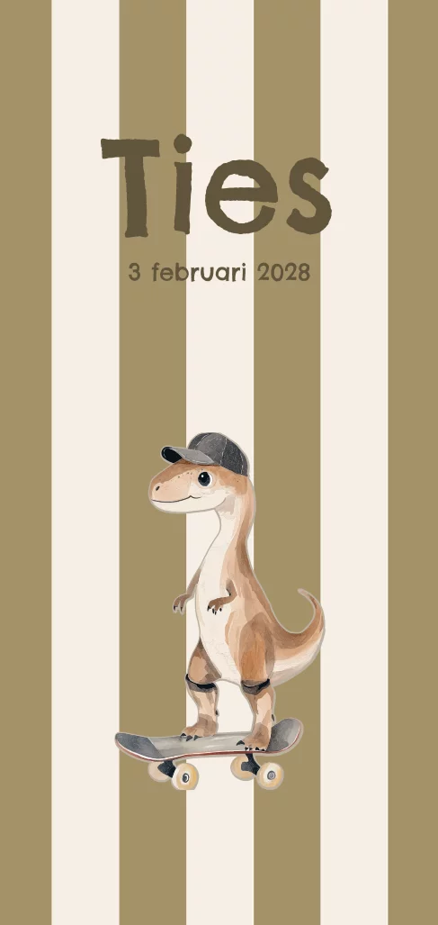 Geboortekaartje streepprint groenbruin met dino op skateboard