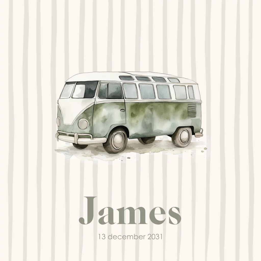 Stoer geboortekaartje jongen met groen busje en streepprint